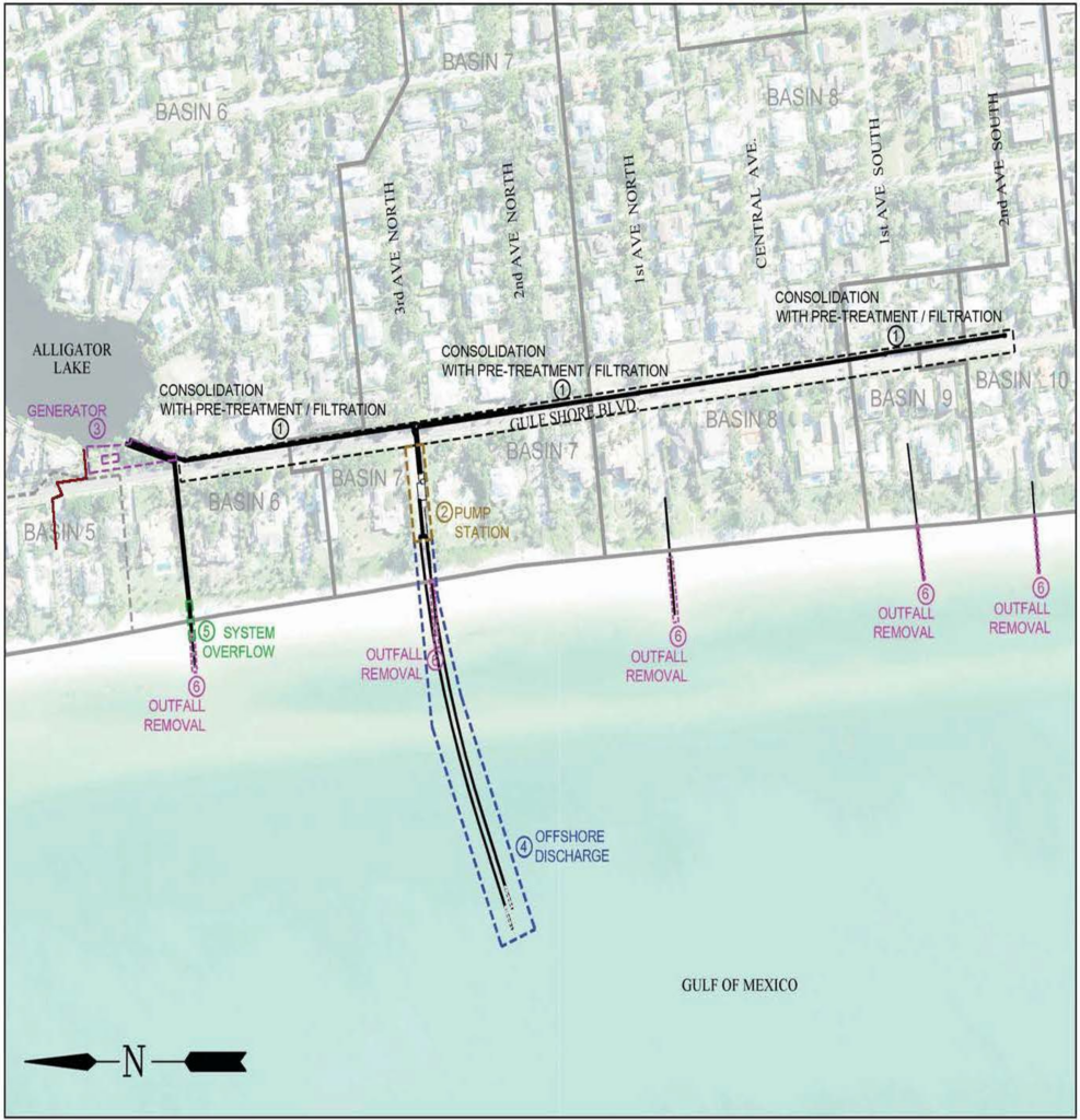 The Naples Beach Stormwater Outfall Project is removing all eight (8) city stormwater outfall pipes from the Naples beaches that currently discharge stormwater into the Gulf of Mexico as directed by the Florida Department of Environmental Protection (FDEP). These improvements are designed to increase the level of service from a 5-year storm event to a 25-year storm event. The project area consists of the Gulf Shore Boulevard (GSB) right-of-way (ROW) between Oleander Drive and just south of 2nd Avenue South along Gulf Shore Boulevard.